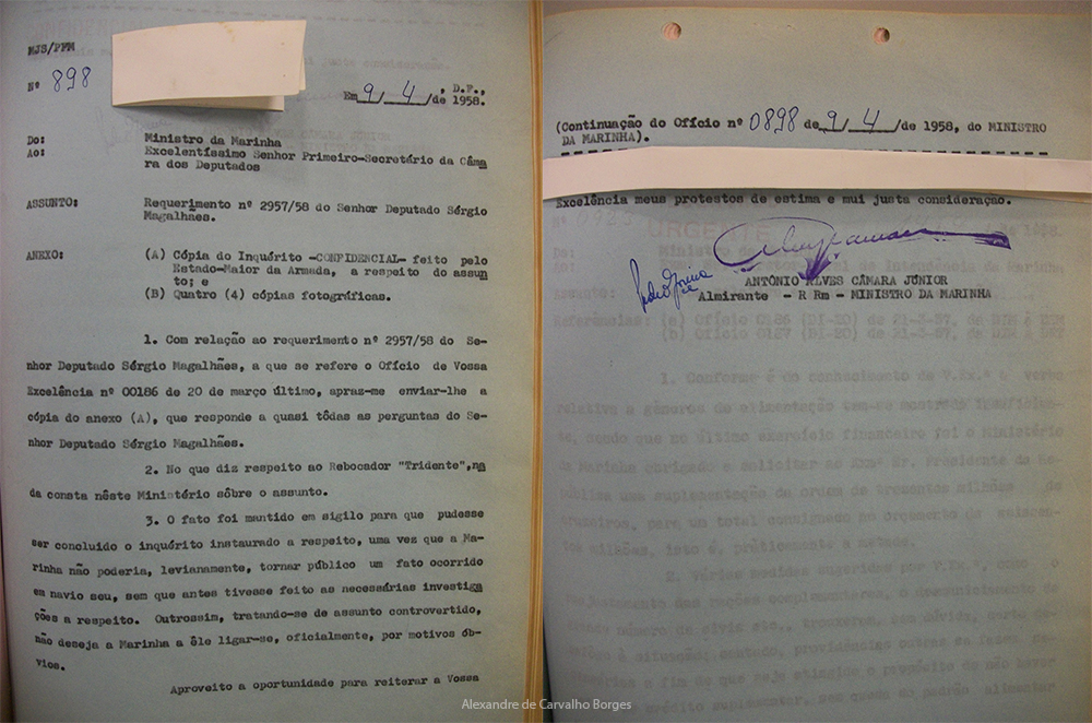b) Duas páginas do ofício confidencial de nº 898, de 09 de abril de 1958, emitido pelo ministro da Marinha, o almirante de esquadra Antonio Alves Câmara Júnior, ao deputado Sérgio Magalhães (PTB/DF), em resposta ao seu Requerimento de Informações da Câmara 2957/58. [3] Uma página deste ofício, não confidencial, completamente em branco e apenas com o cabeçalho também foi resgatada;