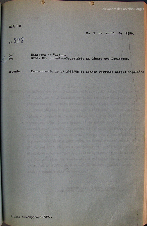 a) Documento remetido pelo ministro da Marinha, o almirante de esquadra Antônio Alves Câmara Júnior, ao deputado Sérgio Magalhães (PTB/DF), em resposta ao seu Requerimento de Informação da Câmara (RIC) 2957/1958;