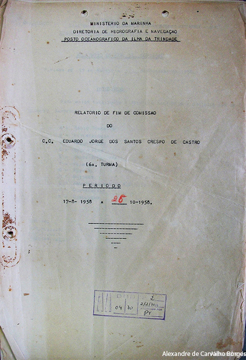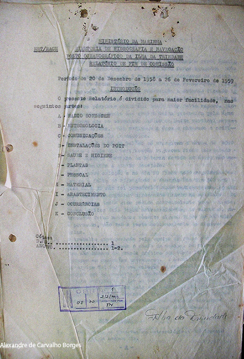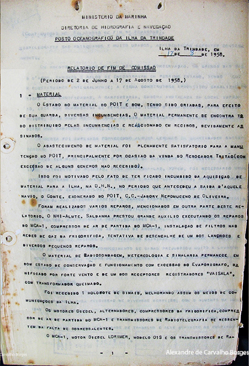 b) Relatório de fim de comissão do posto oceanográfico da Ilha da Trindade: período de 1º de novembro de 1957 a 16 de janeiro de 1958. Este é o relatório da 2ª Turma do posto oceanográfico (POIT), assinado pelo capitão de corveta Carlos Ferreira Bacellar e comandante da ilha na ocasião.